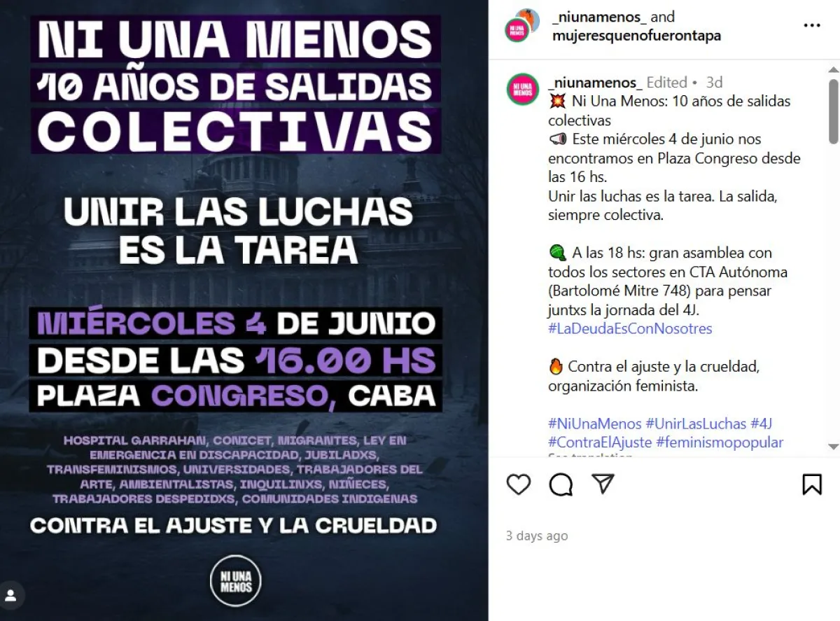 Este martes 3 de junio se conmemoran 10 años del primer Ni Una Menos y desde la organización decidieron pasar la movilización al miércoles para sumarse a la protesta de los jubilados, discapacitados y los residentes del Hospital Garrahan. "Ni Una Menos. 10 años de salidas colectivas. Unir las luchas es la tarea”, señala el flyer difundido por el Colectivo Ni Una menos. Por primera vez desde que se realiza esta movilización, cuyo objetivo es visibilizar el drama que enfrentan las mujeres por la violencia de género y los femicidios, se decidió modificar la fecha para acompañar el reclamo de los jubilados. Por este motivo, en lugar de convocar para este martes 3 de junio, se está haciendo para el miércoles 4 a las 16.00 frente al Congreso para protestar "contra el ajuste y la crueldad”. Desde la organización también llaman a participar a partir de "las 18 a la gran asamblea con todos los sectores en CTA Autónoma (Bartolomé Mitre 748) para pensar juntxs la jornada del 4J". El 3 de junio de 2015, una multitud tomó las calles de todo el país bajo una consigna clara y urgente: Ni Una Menos, en reacción al femicidio de Chiara Páez, una adolescente de 14 años asesinada por su novio en Santa Fe. Esta reacción se transformó en un movimiento colectivo que marcó un antes y un después en la historia del feminismo argentino. La convocatoria fue impulsada por un grupo de activistas, periodistas, escritoras, artistas y estudiantes, entre otros movimientos, que canalizó el hartazgo frente a la violencia machista. La consigna, tomada del poema de la mexicana Susana Chávez, asesinada en 2011, se volvió símbolo de una lucha que traspasó fronteras y se replicó en toda América Latina.Ni Una Menos: a 10 años del primer grito colectivo contra la violencia de género y el femicidio
