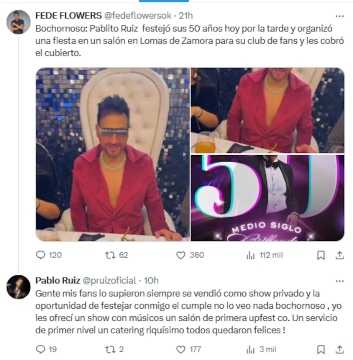 La cuenta de X Real Time Rating explicó que “Pablito Ruiz festejó los 50 años con sus fans en un salón de Lomas de Zamora y les cobró el cubierto. Lo insólito es que todos se enteraron del cobro una vez en la fiesta”.