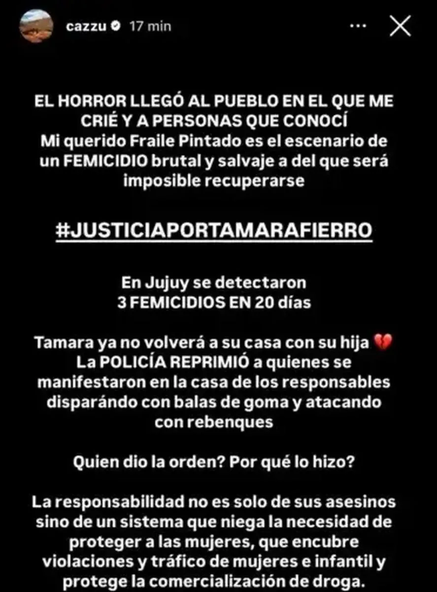 En su descargo, Cazzu también apuntó contra la represión sufrida por los vecinos durante las protestas: “En Jujuy se detectaron 3 femicidios en 20 días. Tamara ya no volverá a su casa con su hija. La policía reprimió a quienes se manifestaron en la casa de los responsables disparando con balas de goma y atacando con rebenques. ¿Quién dio la orden? ¿Por qué lo hizo?”.
