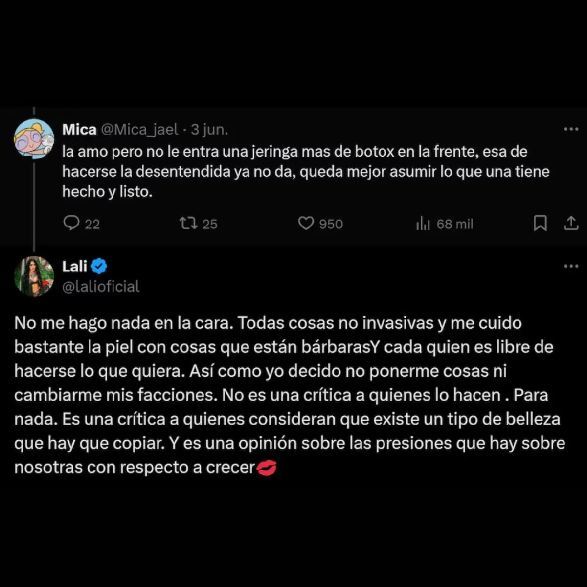 Frente a la ola de críticas, Lali optó por no quedarse callada. A través de sus redes sociales, compartió su postura con total claridad: “No me hago nada en la cara. Todas cosas no invasivas y me cuido bastante la piel con cosas que están bárbaras y cada quien es libre de hacerse lo que quiera. Así como yo decido no ponerme cosas ni cambiarme mis facciones”.