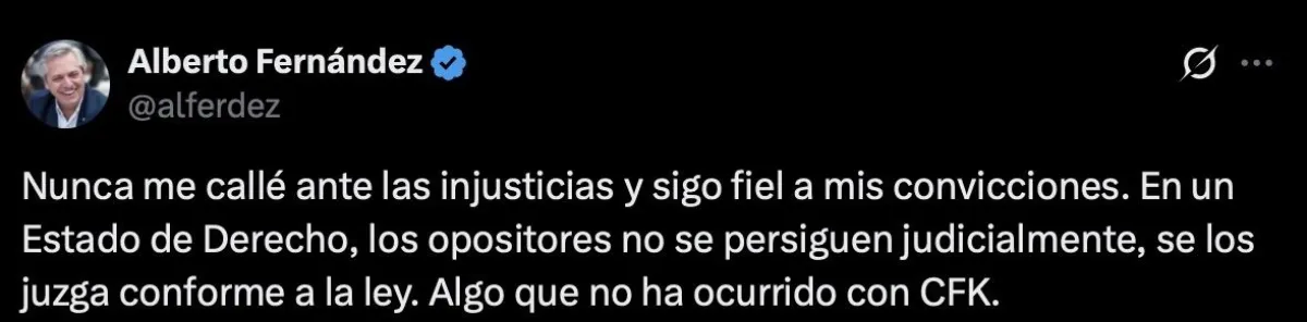 A través de una publicación en su cuenta de X (ex Twitter), Fernández afirmó: “Nunca me callé ante las injusticias y sigo fiel a mis convicciones. En un Estado de derecho, los opositores no se persiguen judicialmente, se los juzga conforme a la ley. Algo que no ha ocurrido con CFK”. Su mensaje se suma a las tensiones políticas que rodean el caso judicial más sensible de los últimos años.
