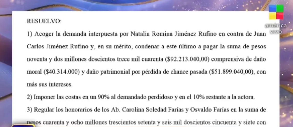 Carlos "La Mona" Jiménez fue condenado judicialmente a pagar una importante suma de dinero como compensación económica a Natalia Romina Taddei, su hija extramatrimonial, a quien debió reconocer legalmente en 2021 luego de un análisis de ADN. El juicio por daños y perjuicios se inició en 2015, luego de que fracasaran los intentos de mediación. La cifra reclamada rondaría los 300 millones de pesos.