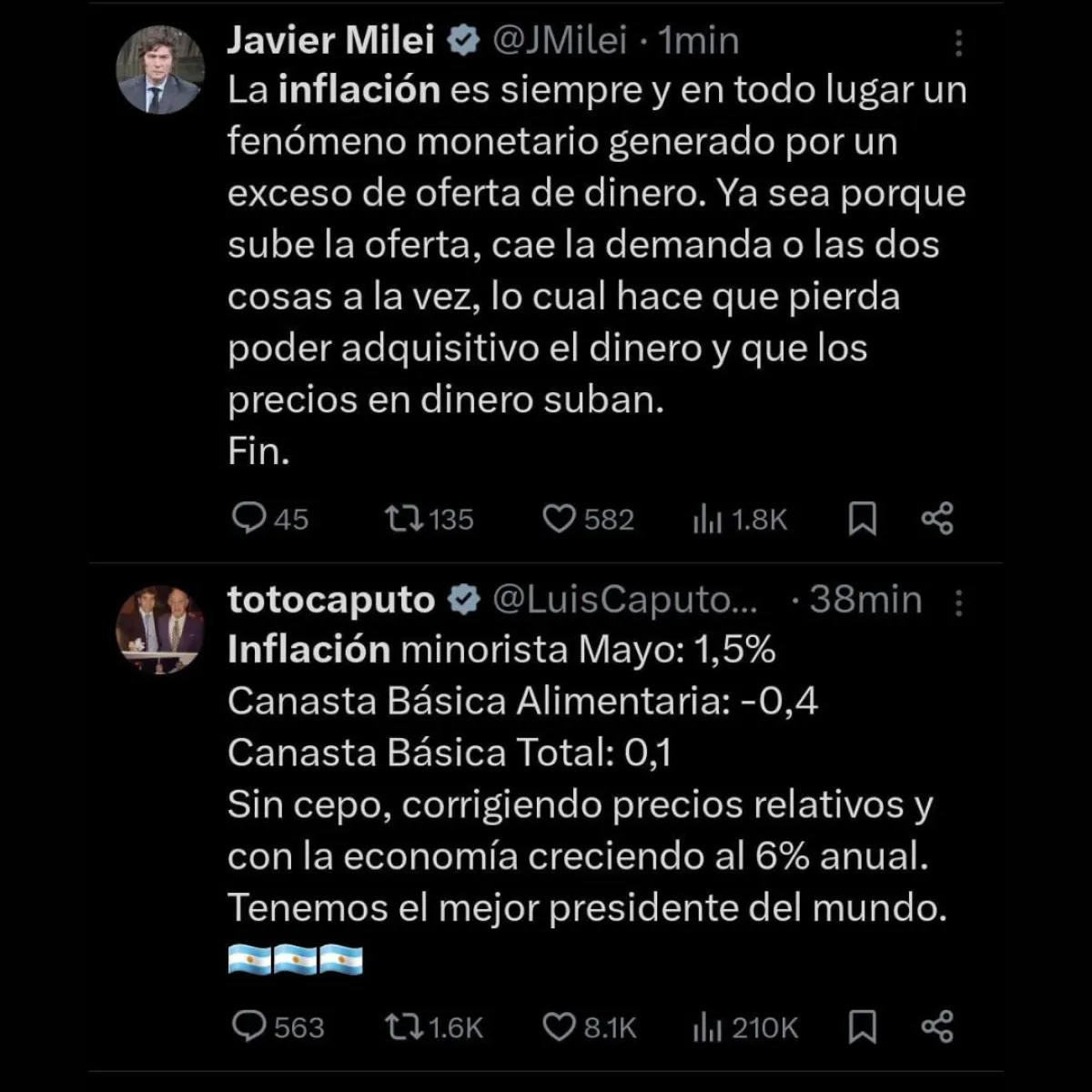 Por su parte, el ministro Caputo también se expresó en la misma red social y enumeró los principales datos divulgados por el organismo oficial: “Inflación minorista Mayo: 1,5%. Canasta Básica Alimentaria: -0,4. Canasta Básica Total: 0,1. Sin cepo, corrigiendo precios relativos y con la economía creciendo al 6% anual. Tenemos el mejor presidente del mundo.” Acompañó el texto con banderas argentinas, en clara señal de apoyo a la gestión actual.