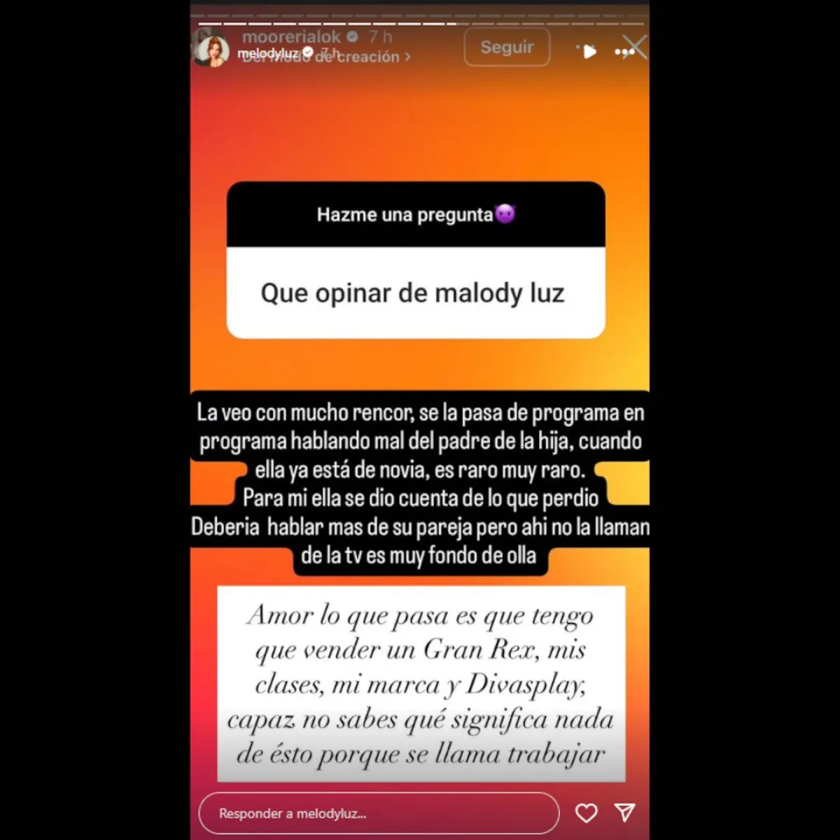 La respuesta de Melody no tardó en llegar. A través de sus redes sociales, la bailarina le contestó sin filtros: “Amor, lo que pasa es que tengo que vender un Gran Rex, mis clases, mi marca y Divasplay. Capaz no sabés qué significa nada de esto porque se llama trabajar”, escribió con ironía.