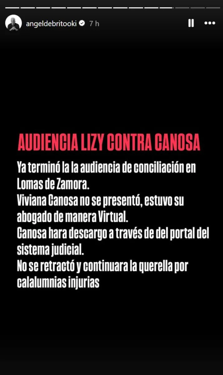 Ángel de Brito sumó más información desde sus redes sociales: “Canosa hará su descargo a través del portal del sistema judicial. No se retractó y continuará la querella (Lizy Tagliani) por calumnias e injurias”.