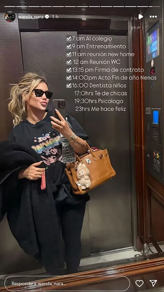 Wanda Nara volvió a ser tema de conversación en redes sociales, por un mensaje que compartió en su cuenta de Instagram. En una selfie tomada en el ascensor, la empresaria detalló su rutina diaria, desde llevar a sus hijos al colegio hasta una sesión con su psicólogo, pero fue el cierre de su agenda lo que captó toda la atención: “23hrs Me hace feliz”.