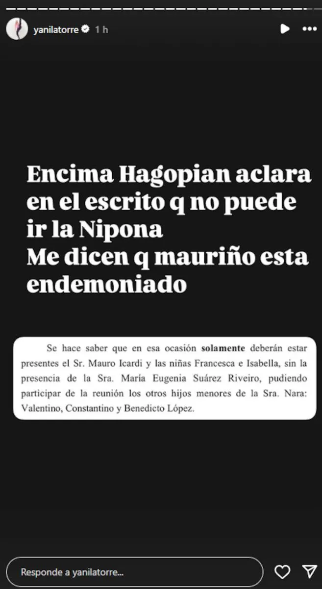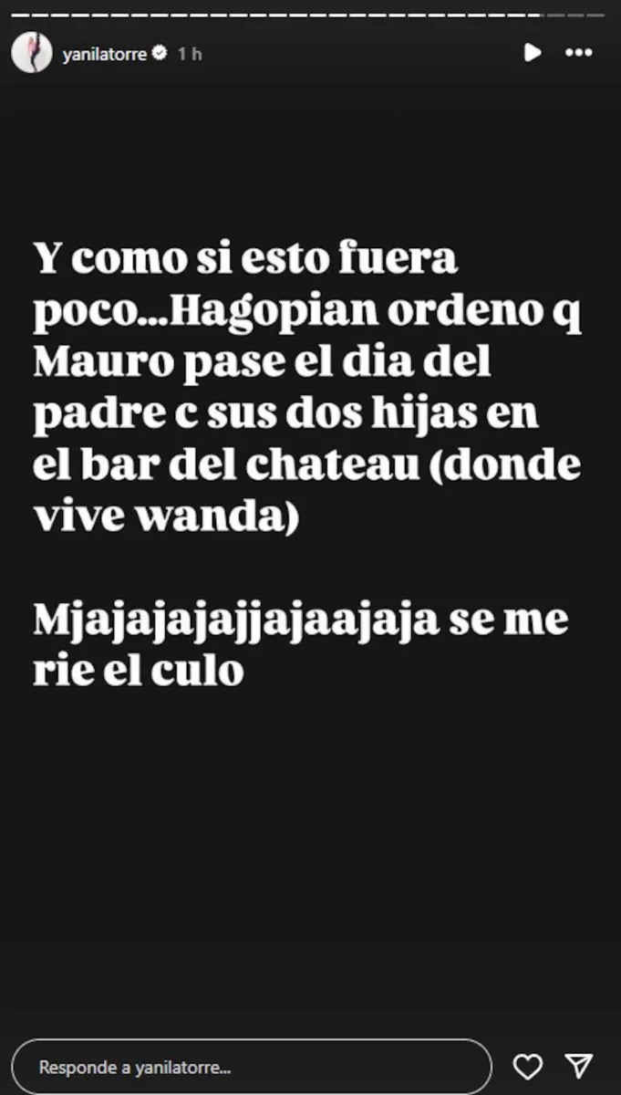 “Hagopian ordenó que Mauro pase el Día del Padre en el bar del Chateau (donde vive Wanda). Jaja, se me ríe el cu...”, expresó la panelista de LAM en una de sus historias.