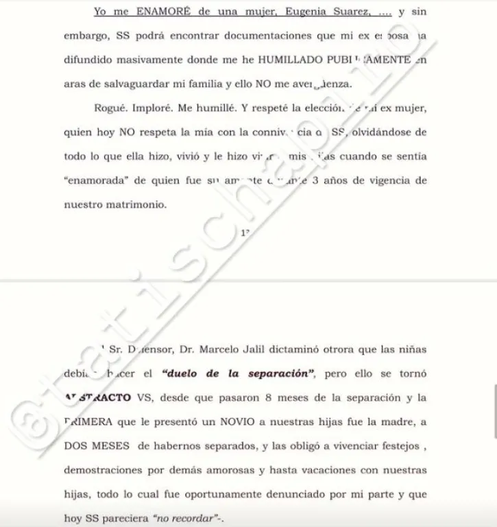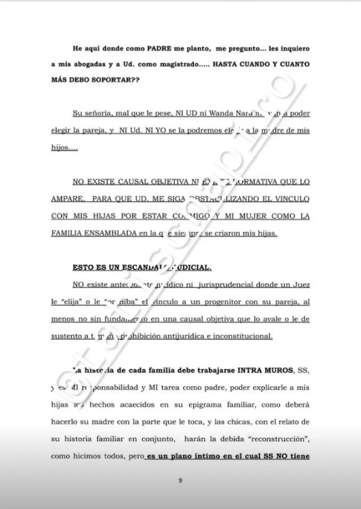 En su escrito que compartió en sus redes Tatiana Schapiro, Icardi se dirigió directamente al juez. “Hace tiempo que únicamente se abocara a ver que Uds. de manera INJUSTA, ARBITRARIA y utilizando una DOBLE VARA, intentan considerarme como ‘hombre’, circunstancia que les es absolutamente ajena porque no corresponde y no estoy dispuesto a consentir ni permitir”.