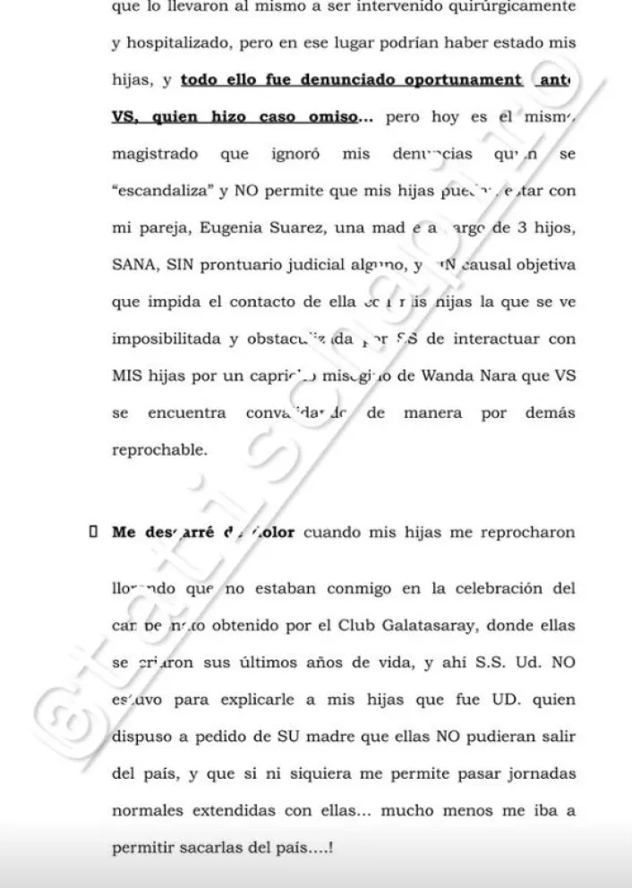 Icardi puso el foco en el vínculo con sus hijas: “He aquí dónde como PADRE me planto, me pregunto… les inquiero a mis abogados y a Ud. como magistrado… HASTA CUANDO Y ¿CUÁNTO MÁS DEBO SOPORTAR??? Su señoría, mal que le pese, NI UD. NI Wanda Nara, me van a elegir la pareja”.