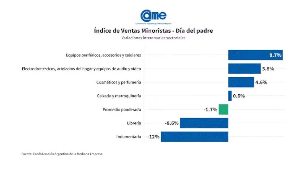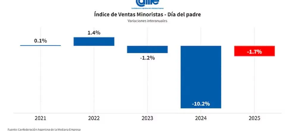 Las ventas minoristas por el Día del Padre registraron una caída del 1,7% en comparación con 2024, según datos de la Confederación Argentina de la Mediana Empresa (CAME). Es el tercer año seguido con resultados negativos para el comercio en esta fecha, consolidando una tendencia preocupante para el sector. En 2024 la baja había sido del 10,2%, y en 2023 del 1,2%.