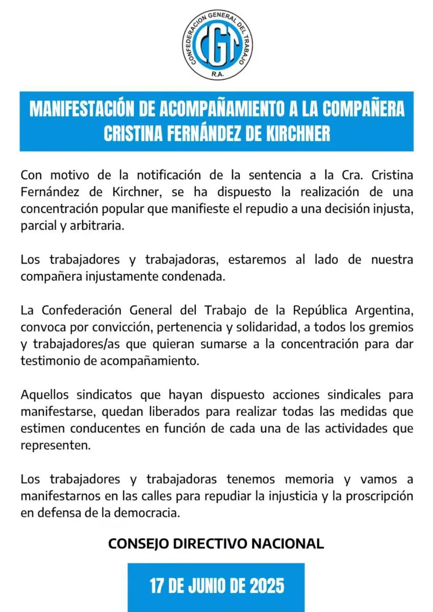La Confederación General del Trabajo (CGT) anunció este martes su adhesión a la movilización convocada para este miércoles 18 de junio a las 10 de la mañana, en apoyo a Cristina Fernández de Kirchner, quien recibió recientemente el beneficio de la prisión domiciliaria.