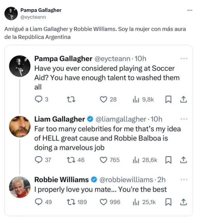 Lo que parecía imposible en el universo del britpop sucedió esta semana, gracias a la intervención de una usuaria argentina. Conocida en redes como Pampa Gallagher, logró que Liam Gallagher y Robbie Williams dejaran atrás una histórica rivalidad con una inesperada interacción que se volvió viral.