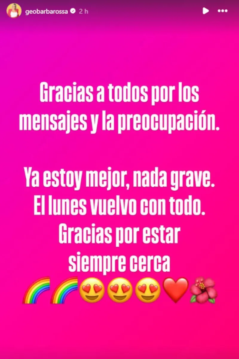 Después de abandonar inesperadamente su programa en vivo, Georgina Barbarossa utilizó sus redes sociales para llevar tranquilidad a sus seguidores.