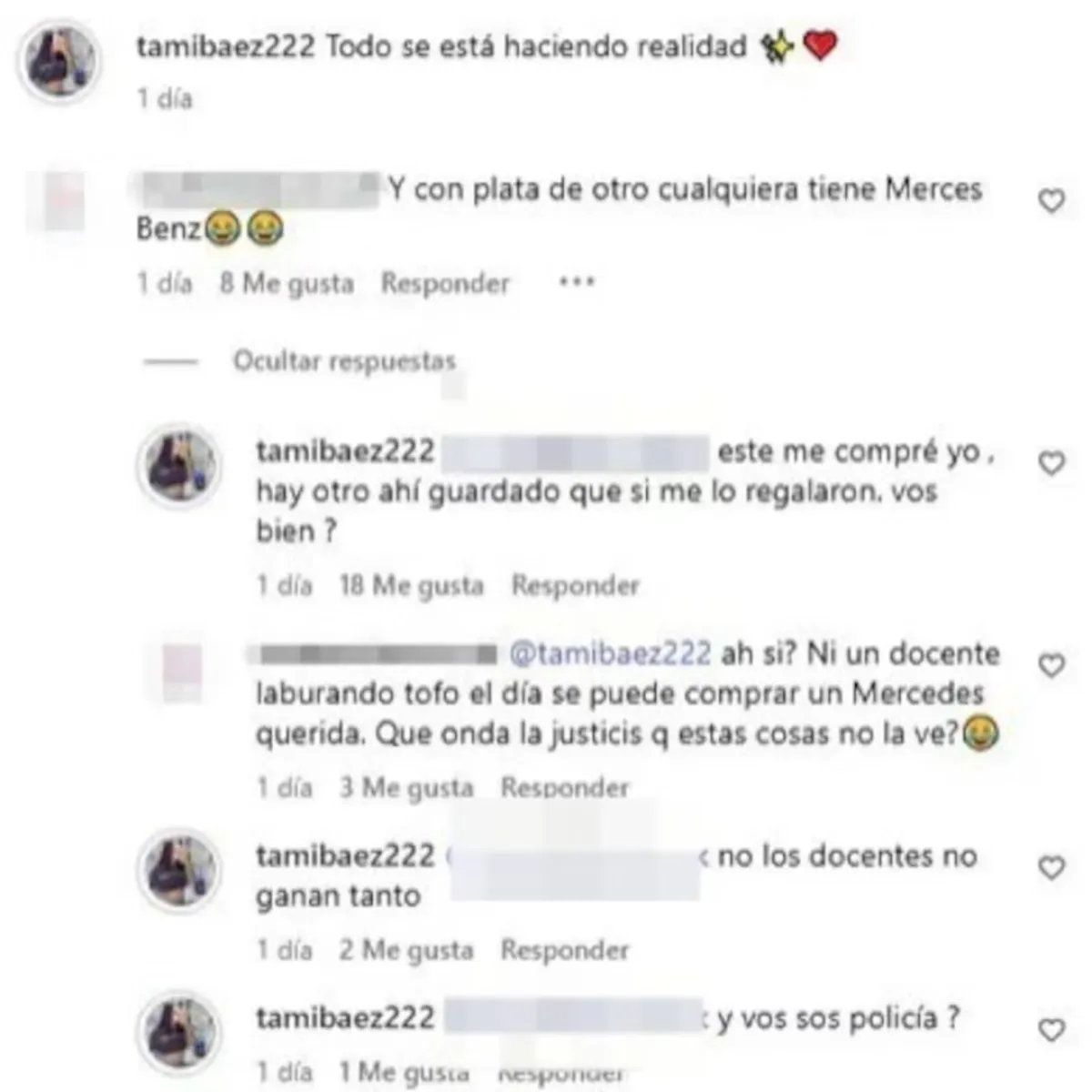 La conversación continuó cuando el mismo usuario comparó su situación con la de los trabajadores de la educación: “¿Ah sí? Ni un docente laburando todo el día puede comprar un Mercedes”. A lo que Tamara retrucó con firmeza e ironía: “No, los docentes no ganan tanto. ¿Y vos sos policía?” De esta manera, la influencer defendió con orgullo lo que considera un logro personal.