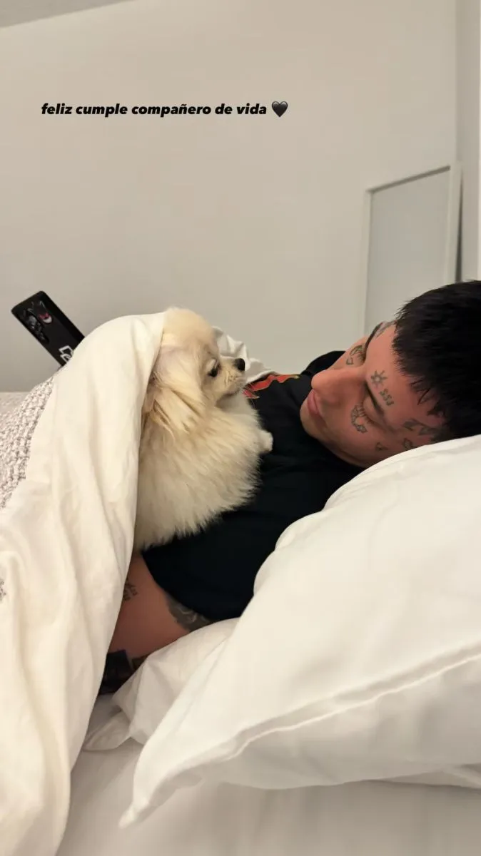 Emilia Mernes subió una historia a Instagram con una foto del cantante descansando en la cama junto a Roma, su perrita, y escribió: “Feliz cumple compañero de vida”, y un emoji de corazón negro.