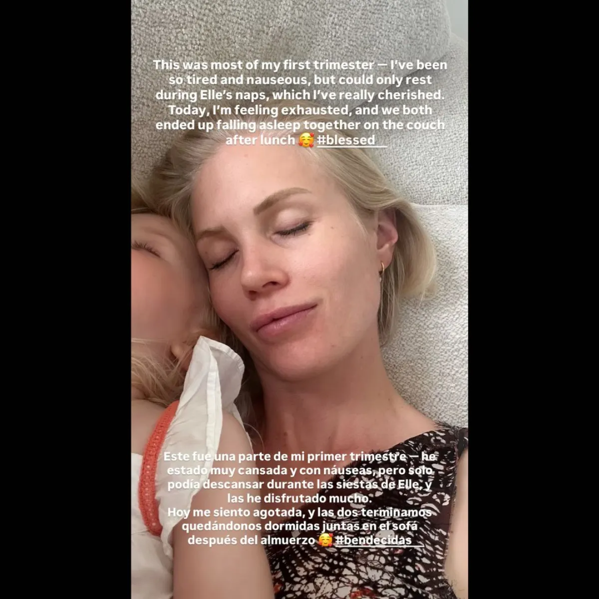 Daniela aprovechó su cuenta personal para abrir una ventana a la intimidad del inicio de la gestación. En su mensaje, confesó algunas de las dificultades que ha enfrentado en estas primeras semanas, especialmente el cansancio extremo y las náuseas. Sin embargo, también destacó que ha podido sobrellevar estos síntomas al compartir momentos de descanso con su hija mayor, Elle, quien ya tiene dos años. “Esta fue una parte de mi primer trimestre— he estado muy cansada y con náuseas— pero solo podía descansar durante las siestas de Elle“, escribió, acompañando sus palabras con una imagen que muestra a ambas dormidas en un sillón.