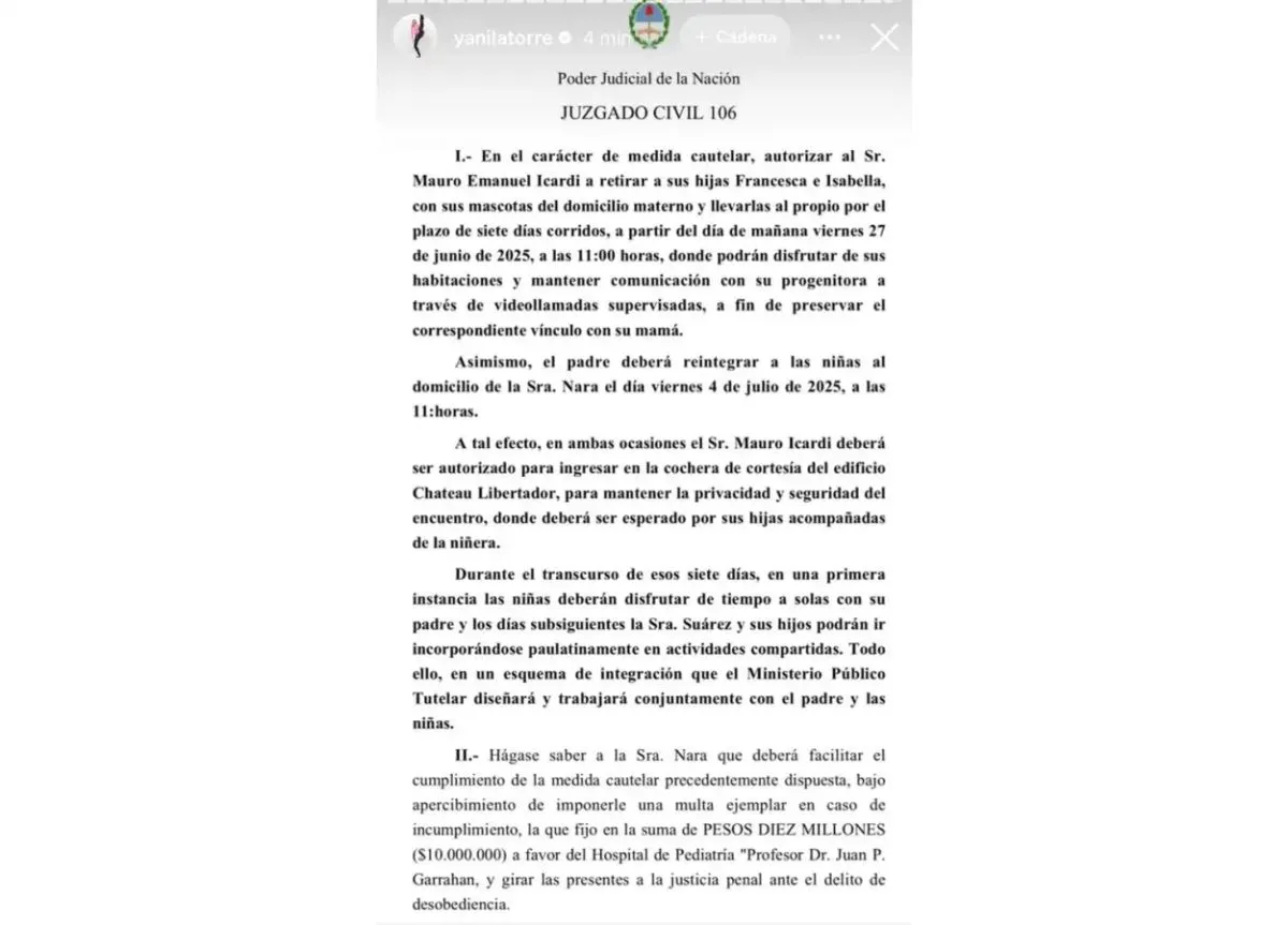 Además, el documento establece que “podrán disfrutar de sus habitaciones y mantener comunicación con su progenitora (Wanda Nara) a través de videollamadas supervisadas”, y que “el padre deberá reintegrar a las niñas al domicilio de la Sra. Nara el día viernes 4 de julio de 2025, a las 11 horas”.