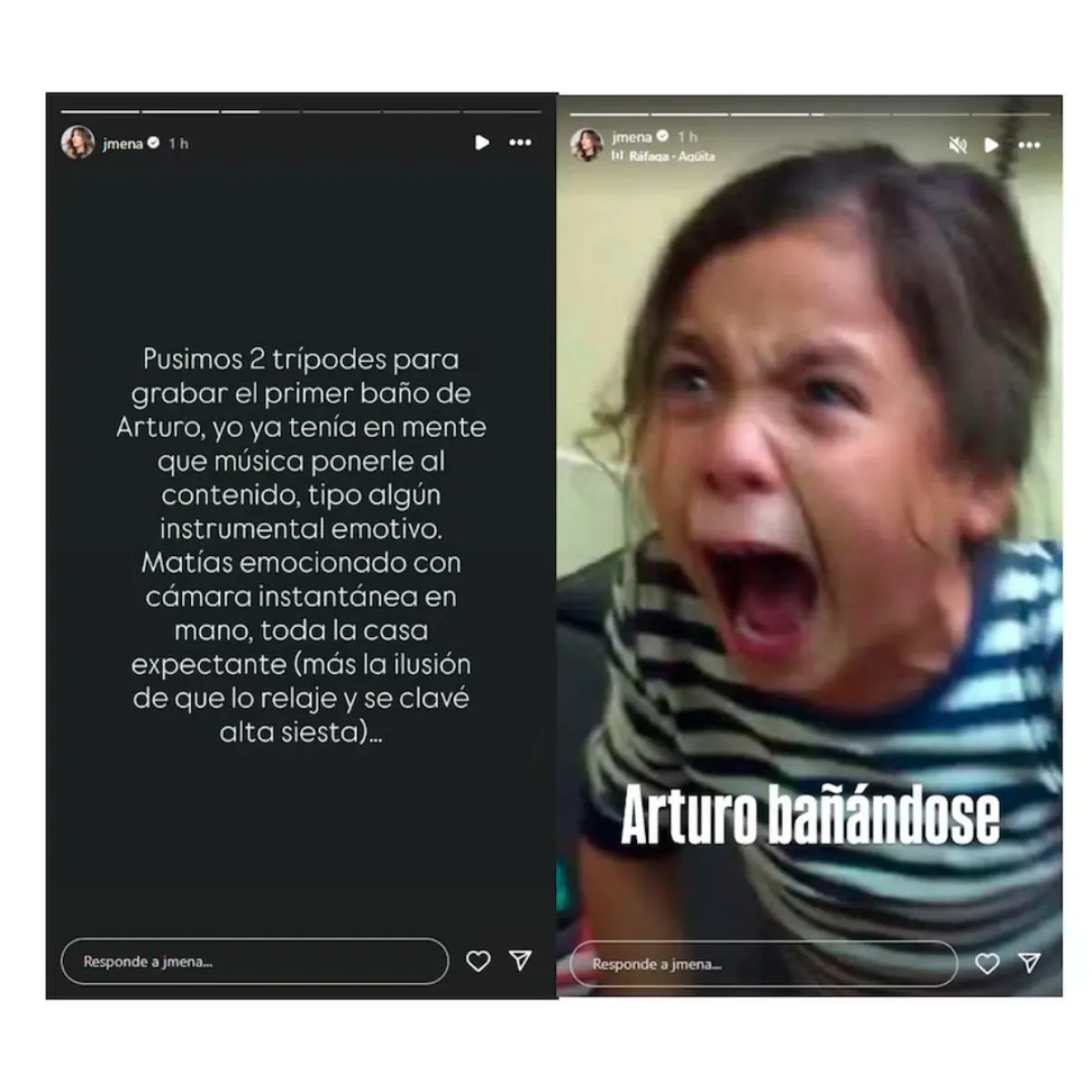 Sin embargo, la realidad fue muy distinta a lo que habían soñado. Apenas comenzó el baño, el pequeño reaccionó con llanto y evidente incomodidad. Para ilustrar la situación, Jimena recurrió al humor: en una segunda historia compartió un meme de un niño llorando a los gritos, reflejando el caos vivido durante el intento fallido de baño relajante. La escena idealizada con música suave quedó completamente desvirtuada por los gritos y la tensión del bebé.