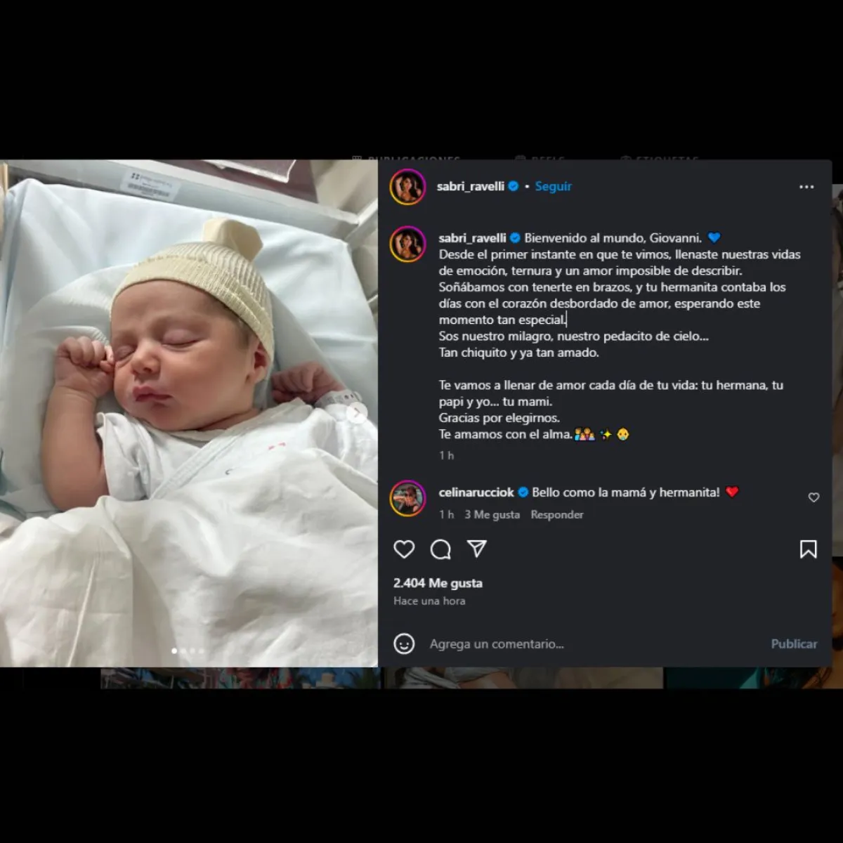 En una publicación cargada de emoción, Ravelli escribió: “Bienvenido al mundo, Giovanni. Desde el primer instante en que te vimos, llenaste nuestras vidas de emoción, ternura y un amor imposible de describir”. Junto al mensaje, publicó una dulce foto del pequeño recostado en la cuna del hospital, visiblemente conmovida por la llegada de su hijo.