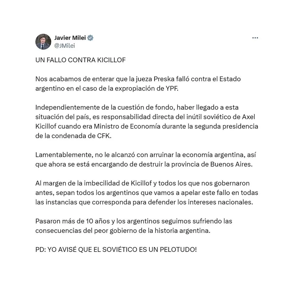 Milei, a través de su cuenta oficial de X, fue categórico en su mensaje: “Nos acabamos de enterar que la jueza Preska falló contra el Estado argentino en el caso de la expropiación de YPF. Independientemente de la cuestión de fondo, haber llegado a esta situación del país es responsabilidad directa del inútil soviético de Axel Kicillof cuando era Ministro de Economía durante la segunda presidencia de la condenada de CFK”.