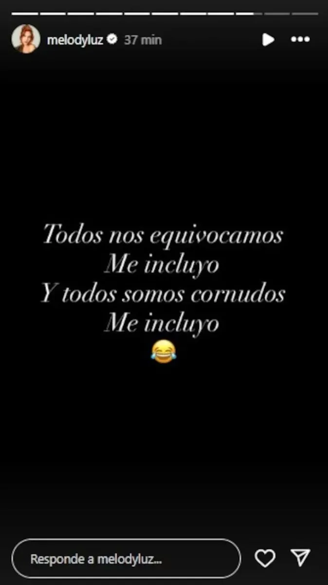 Después de una relación marcada por idas y vueltas, Melody Luz sorprendió al confirmar su reconciliación con Alex Caniggia a través de una historia en Instagram, donde escribió: “Todos nos equivocamos. Me incluyo. Y todos somos cornudos. Me incluyo”.
