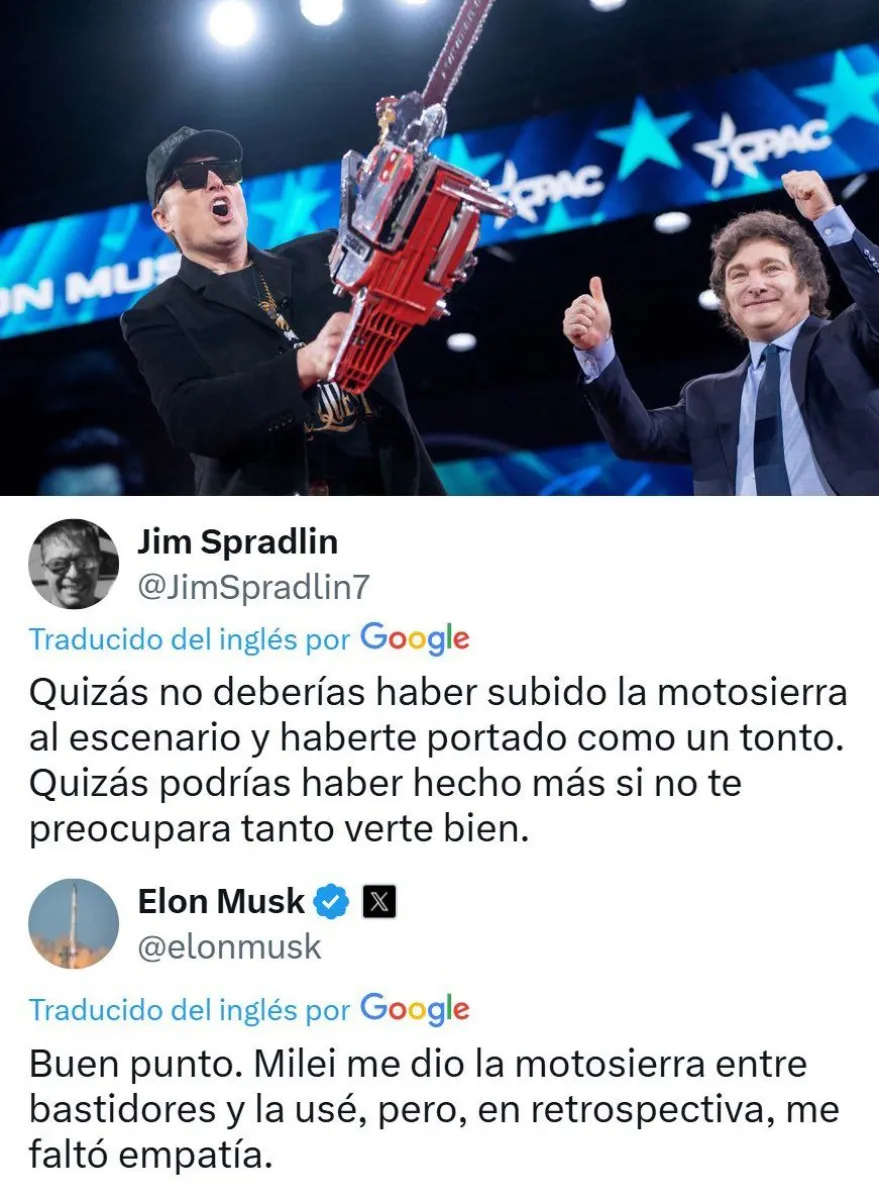 El empresario le respondió a un usuario que lo había criticado por usar el objeto sobre el escenario de la CPAC. “Milei me dio la motosierra entre bastidores y la usé, pero, en retrospectiva, me faltó empatía”, expresó.