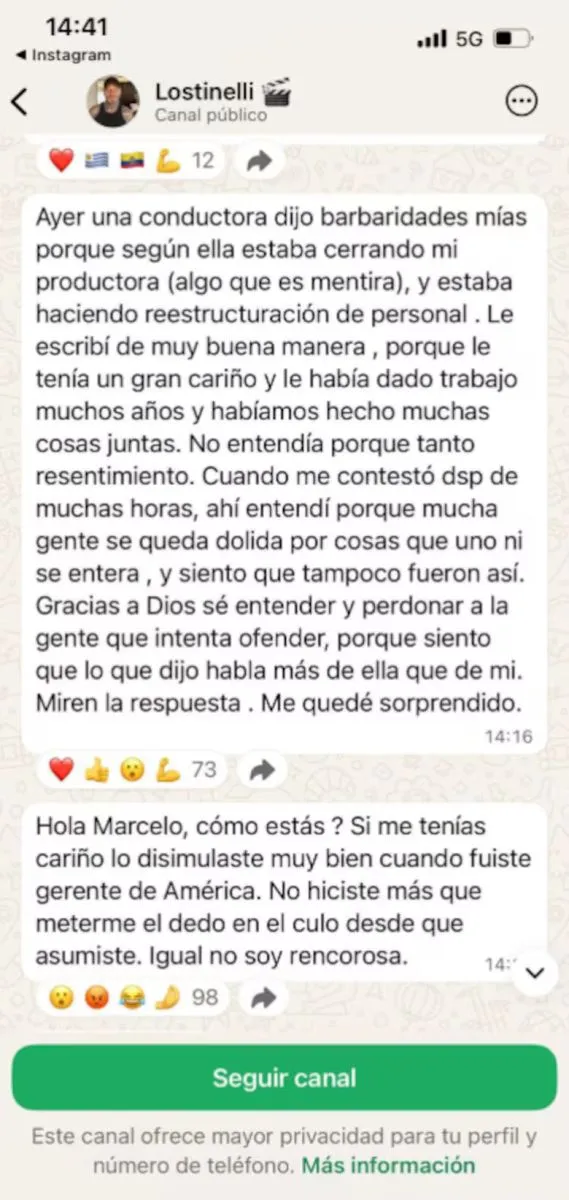 Marcelo también compartió la respuesta que Flor le dio: “Hola Marcelo, ¿cómo estás? Si me tenías cariño lo disimulaste muy bien cuando fuiste gerente de América. No hiciste más que meterme el dedo en el cul... desde que asumiste. Igual no soy rencorosa”, escribió la conductora.