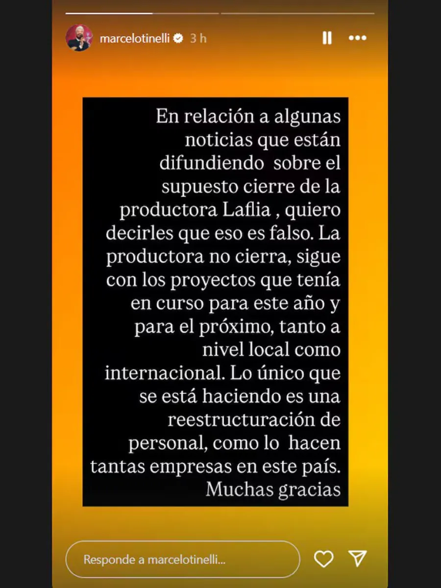 “Le escribí de muy buena manera, porque le tenía un gran cariño y le había dado trabajo muchos años y habíamos hecho muchas cosas juntas. No entendía por qué tanto resentimiento”, explicó Tinelli en el mensaje a sus seguidores. Y agregó: “Cuando me contestó después de muchas horas, ahí entendí por qué mucha gente se queda dolida por cosas que uno ni se entera, y siento que tampoco fueron así”.