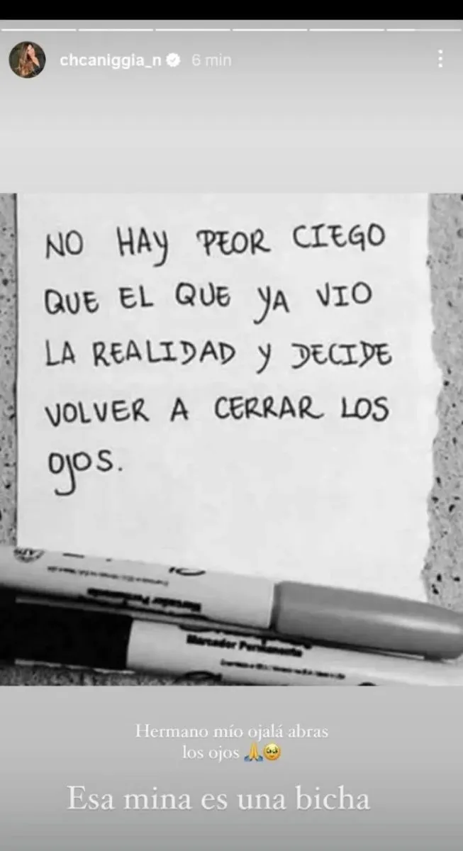 Charlotte Caniggia rompió el silencio y apuntó contra Melody Luz, la pareja de su hermano Alex. En una historia de Instagram, publicó una frase que encendió la polémica: “No hay peor ciego que el que ya vio la realidad y decide volver a cerrar los ojos”, y la acompañó con un mensaje contundente para su mellizo: “Hermano mío, ojalá abras los ojos”.