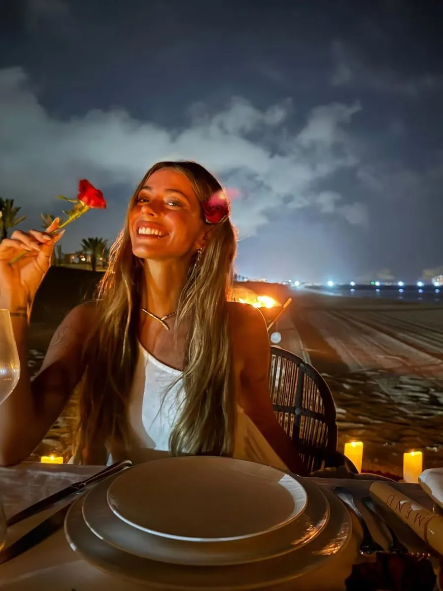 Poco después, Tini compartió una serie de fotos desde una playa paradisíaca, rodeada de velas, flores, mar y una constante ocultación de una de sus manos. En una de las tomas, por ejemplo, se la ve en una mesa armada sobre la arena, con una flor en la oreja y una de las manos fuera de la vista, escondida debajo de la mesa.