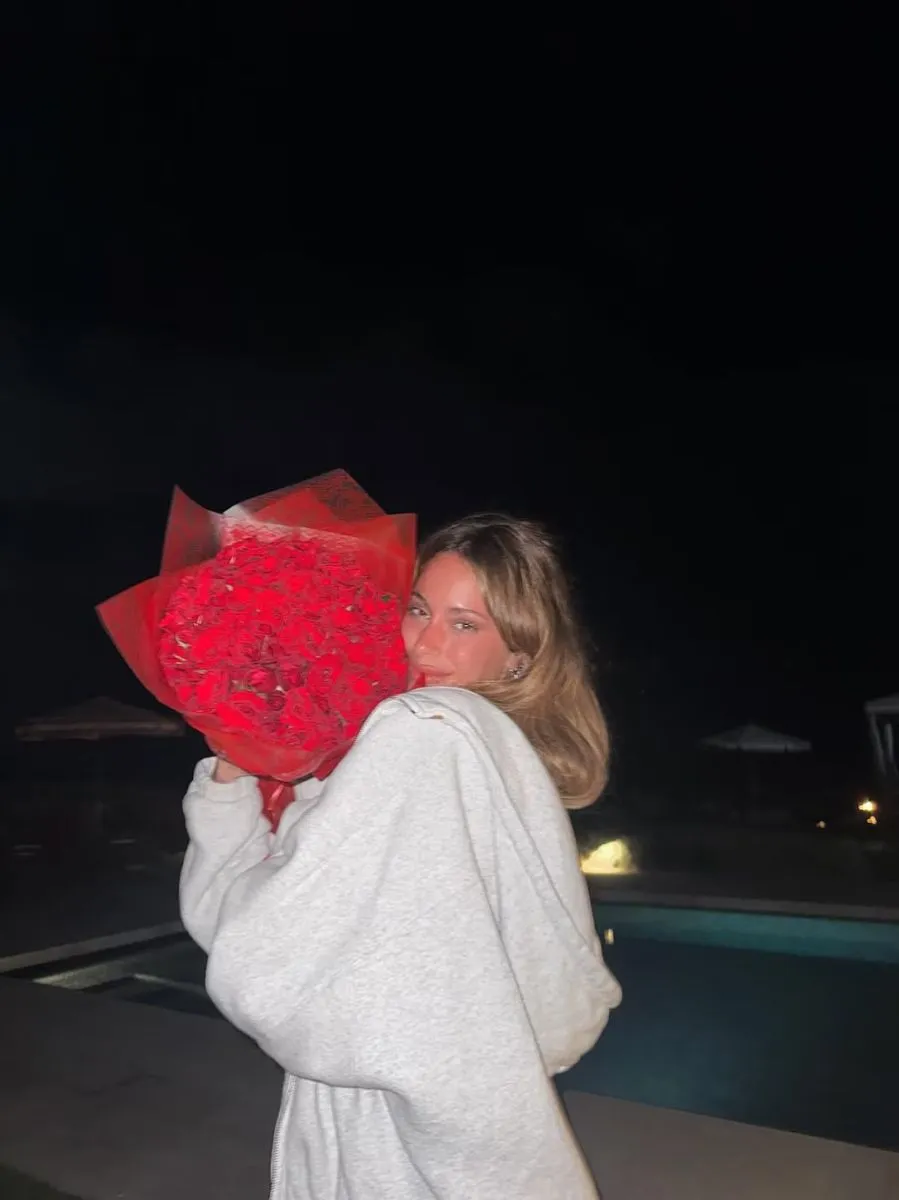 Las imágenes siguientes mostraron una mesa decorada en forma de corazón con velas, sillas vacías listas para una cena íntima, y finalmente a Tini de pie junto a una piscina, abrazando un gran ramo de rosas rojas que le tapa parte de la cara y también, la mano. El remate fue una última foto donde se la ve con un vestido blanco frente al mar, en una pose contemplativa, sosteniendo una rosa mientras una vez más, su mano permanece fuera del encuadre.