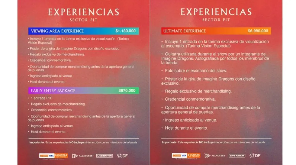 El Viewing Area Experience, por su parte, tiene un precio de $1.130.000 e incluye acceso a una tarima especial de visualización, póster exclusivo, regalos y demás beneficios. Sin embargo, el paquete más costoso es el Ultimate Experience, con solo dos cupos disponibles, cuesta $6.990.000 e incluye una guitarra usada en el show, autografiada por la banda, además de acceso a la tarima VIP y una foto sobre el escenario.