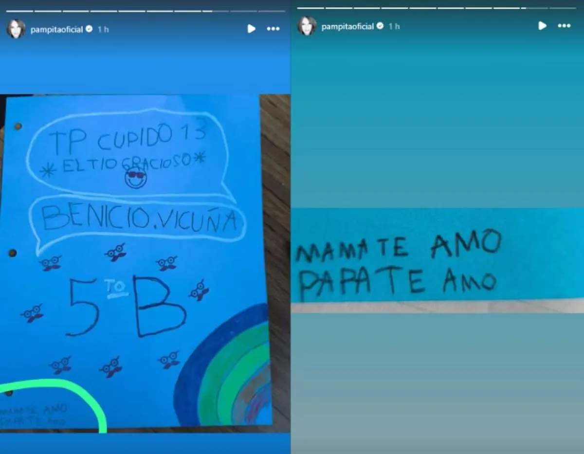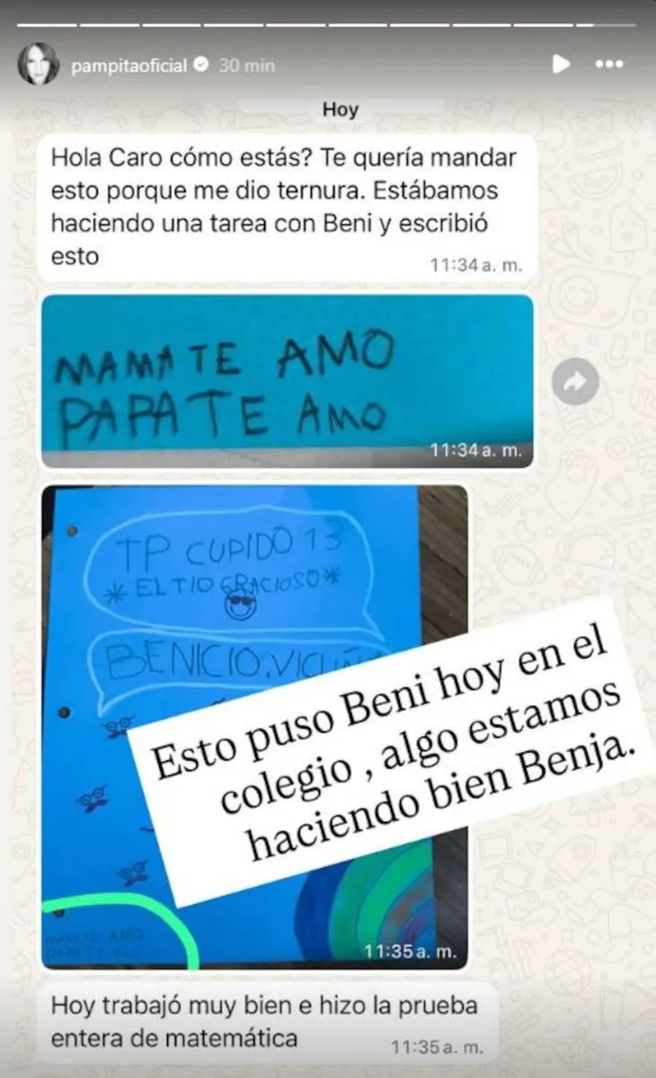 En la imagen adjunta se veía una hoja con la frase: “Mamá te amo. Papá te amo”. Pampita agregó su propio comentario: “Esto puso Beni hoy en el colegio. Algo estamos haciendo bien, Benja”.