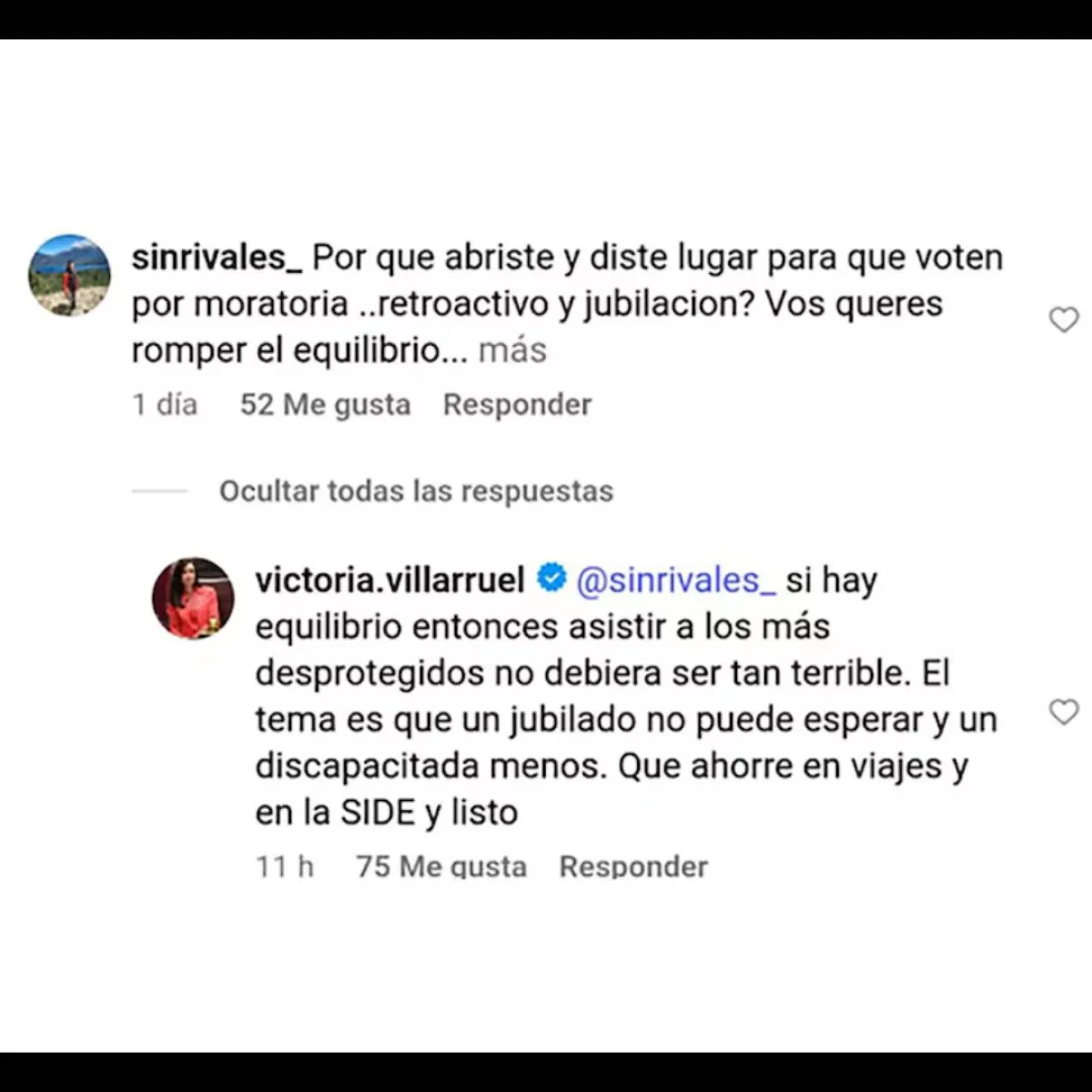 A través de Instagram, la titular del Senado dejó en claro su posición ante las acusaciones de romper con el equilibrio fiscal: “Si hay equilibrio, entonces asistir a los más desprotegidos no debiera ser tan terrible. El tema es que un jubilado no puede esperar y una discapacitada, menos”. Además, cuestionó el uso de los recursos del Estado, sugiriendo que se reduzcan “los gastos en viajes y en la SIDE”.