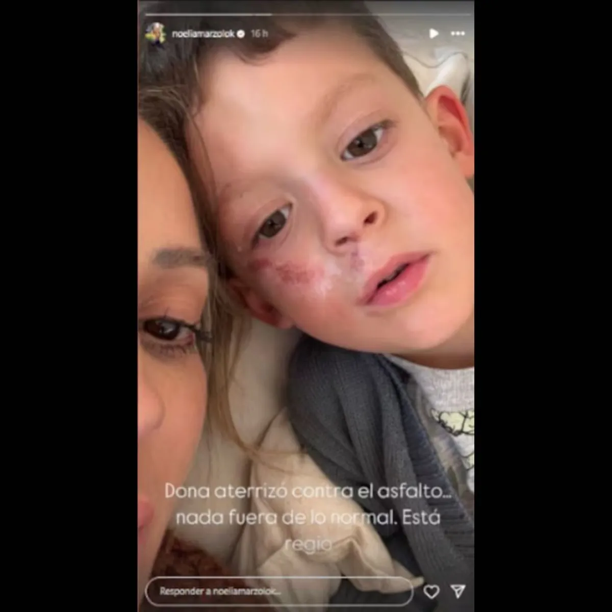Fue a través de una serie de historias en su cuenta de Instagram donde Noelia detalló lo ocurrido. En una de las imágenes se puede ver al niño disfrutando de un helado mientras luce una marca en el pómulo derecho. Sobre la foto, la artista escribió con tono humorístico: “El rey del disturbio”.