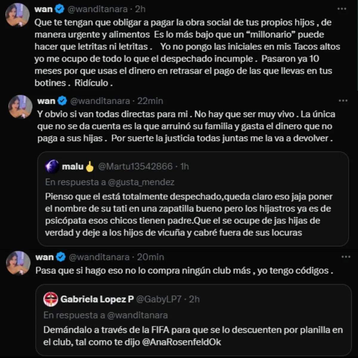 El posteo generó una ola de reacciones por parte de sus seguidores. Una usuaria le respondió: “Pienso que él está totalmente despechado, queda claro eso… Que el se ocupe de las hijas de verdad y deje a los hijos de Vicuña y Cabré fuera de sus locuras”. Wanda no tardó en contestar: “Y obvio, si van todas directas para mí. No hay que ser muy vivo. La única que no se da cuenta es la que arruinó su familia y gasta el dinero que no paga a sus hijas”.