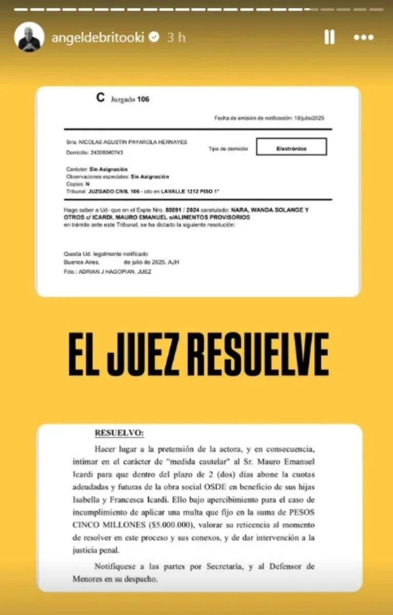 El documento judicial, difundido por Ángel de Brito, establece que el delantero tiene dos días para abonar las cuotas adeudadas y futuras. Además, advierte que en caso de incumplimiento se le aplicará una multa de cinco millones de pesos, sin perjuicio de una posible revisión de la suma y la intervención de la fiscalía correspondiente. La resolución busca garantizar la cobertura médica de las menores en forma inmediata.