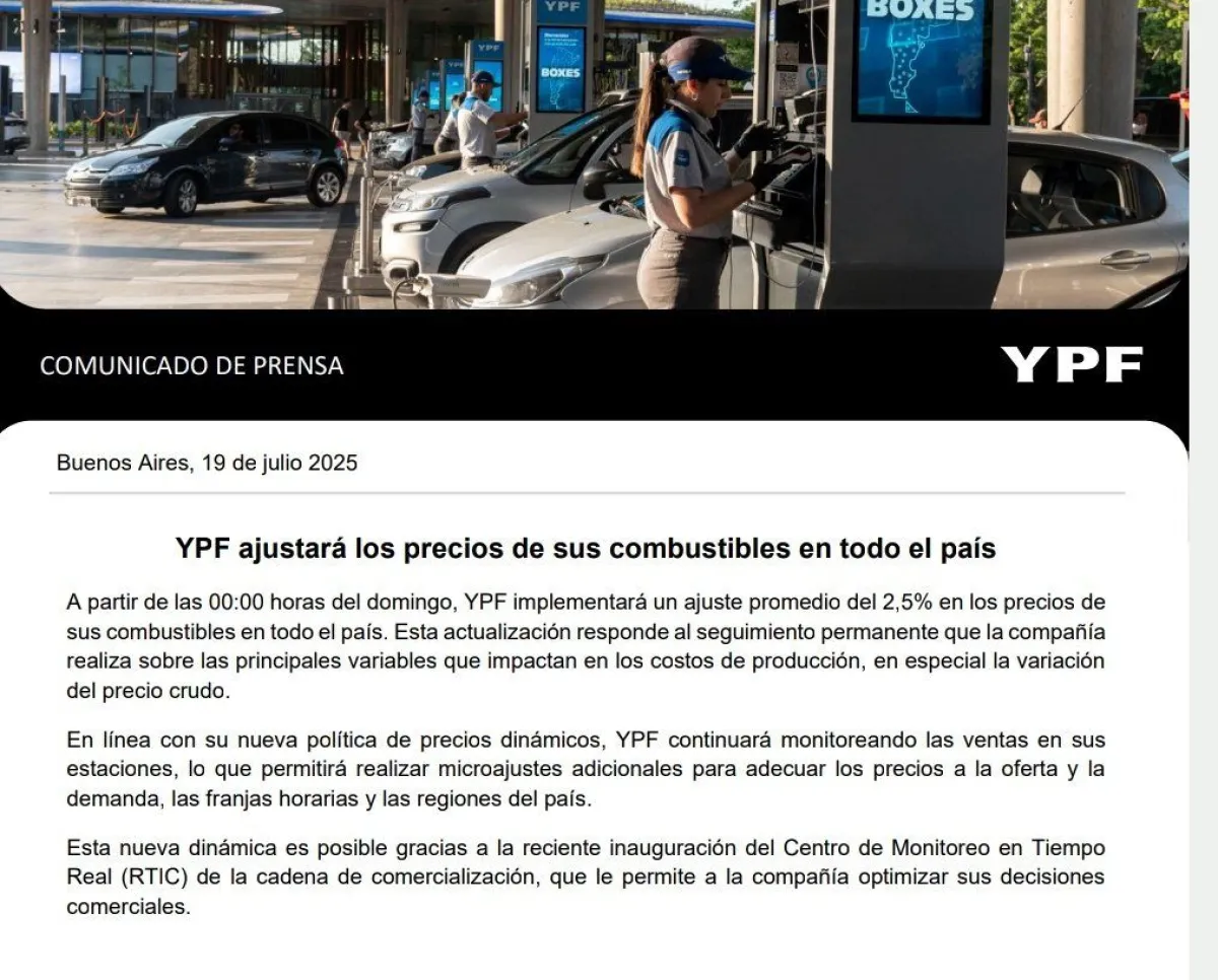 Desde la empresa explicaron que esta suba responde al monitoreo constante de los factores que inciden en los costos de producción, especialmente el comportamiento del precio internacional del petróleo crudo. En un comunicado, YPF sostuvo que continuará aplicando su estrategia de precios dinámicos, ajustando los valores en función de la demanda, la franja horaria y la región geográfica. “YPF continuará monitoreando las ventas en sus estaciones, lo que permitirá realizar microajustes adicionales”, señalaron.
