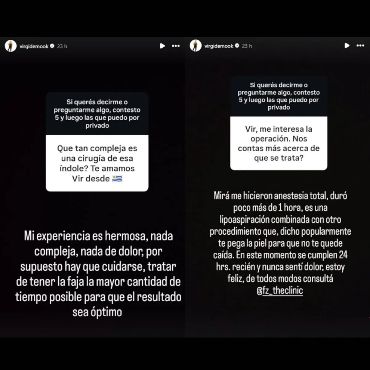 A tan solo 24 horas de la cirugía, Virginia utilizó su cuenta de Instagram para interactuar con sus más de 500 mil seguidores y contar detalles del procedimiento. “Me hicieron anestesia total, duró poco más de una hora, es una lipoaspiración combinada con otro procedimiento que, dicho popularmente, te pega la piel para que no te quede caída. En este momento se cumple 24 horas y nunca sentí dolor, estoy feliz”, explicó la humorista. Además, aseguró que la recuperación fue sorprendentemente llevadera y sin molestias.