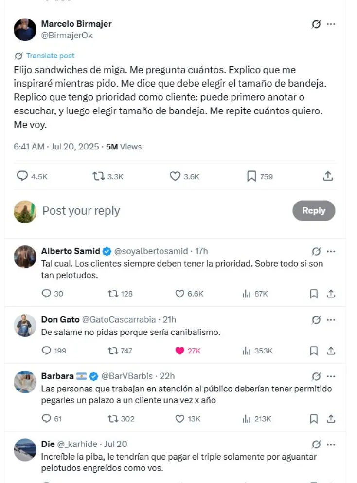"Elijo sandwiches de miga. Me pregunta cuántos. Explico que me inspiraré mientras pido. Me dice que debe elegir el tamaño de bandeja. Replico que tengo prioridad como cliente: puede primero anotar o escuchar, y luego elegir tamaño de bandeja. Me repite cuántos quiero. Me voy", escribió, quizás sin pensar en el alcance de su texto, que ahora acumula 5 millones de vistas.