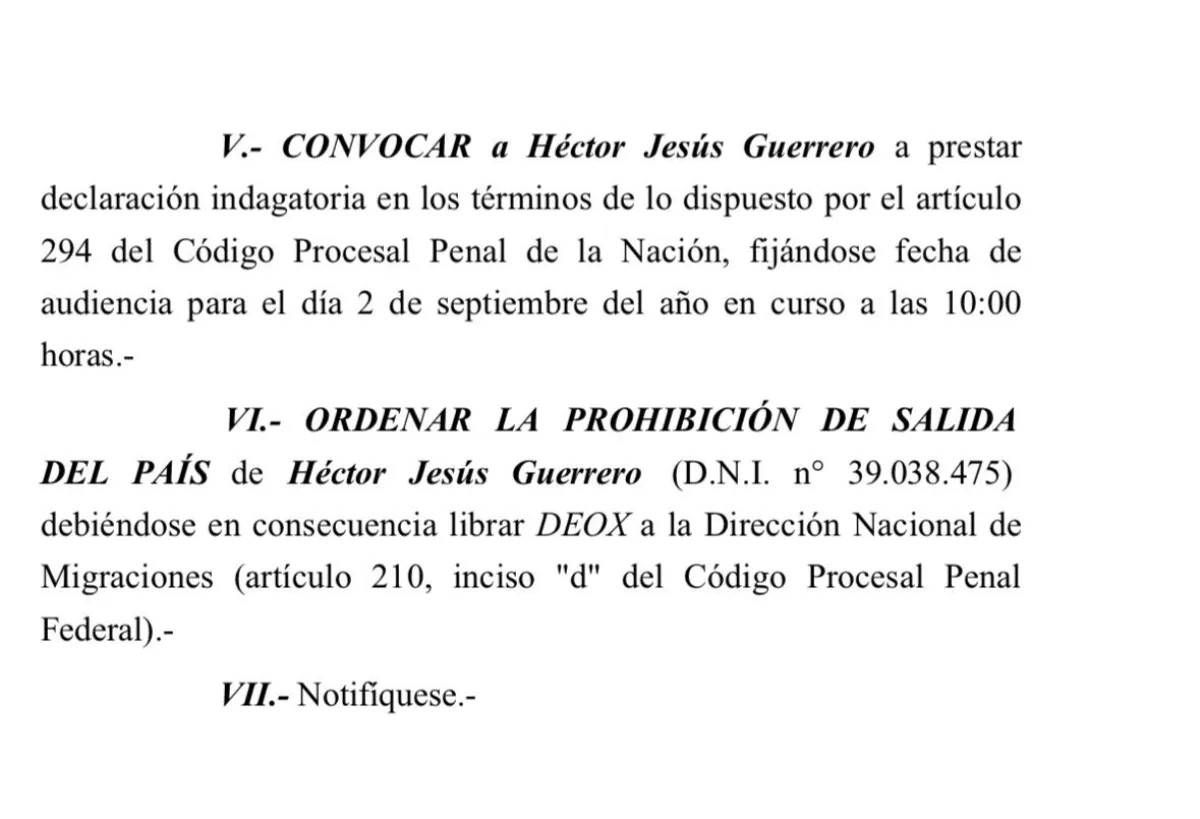 La Justicia ordenó la prohibición de salida del país para Guerrero. La medida fue comunicada a la Dirección Nacional de Migraciones, en el marco del artículo 210, inciso “d” del Código Procesal Penal Federal.