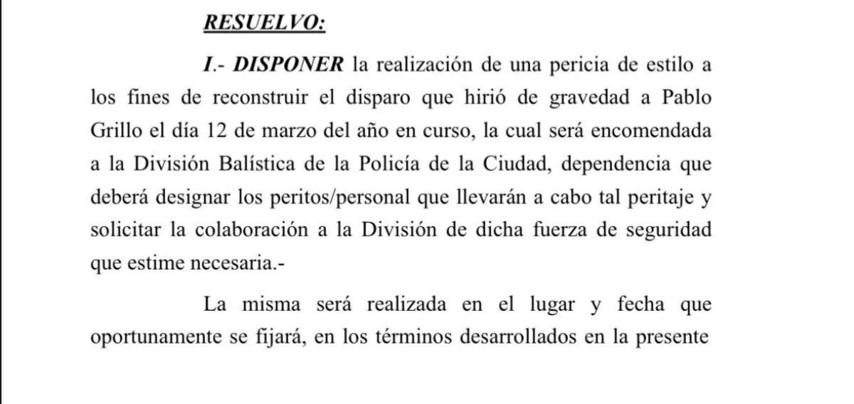 En paralelo, Servini ordenó la realización de una pericia balística para reconstruir el disparo, a cargo de la División Balística de la Policía de la Ciudad. El estudio deberá determinar aspectos clave como la trayectoria, velocidad, ángulo de salida y posición del arma, así como si el proyectil rebotó antes de impactar en la cabeza de Grillo.