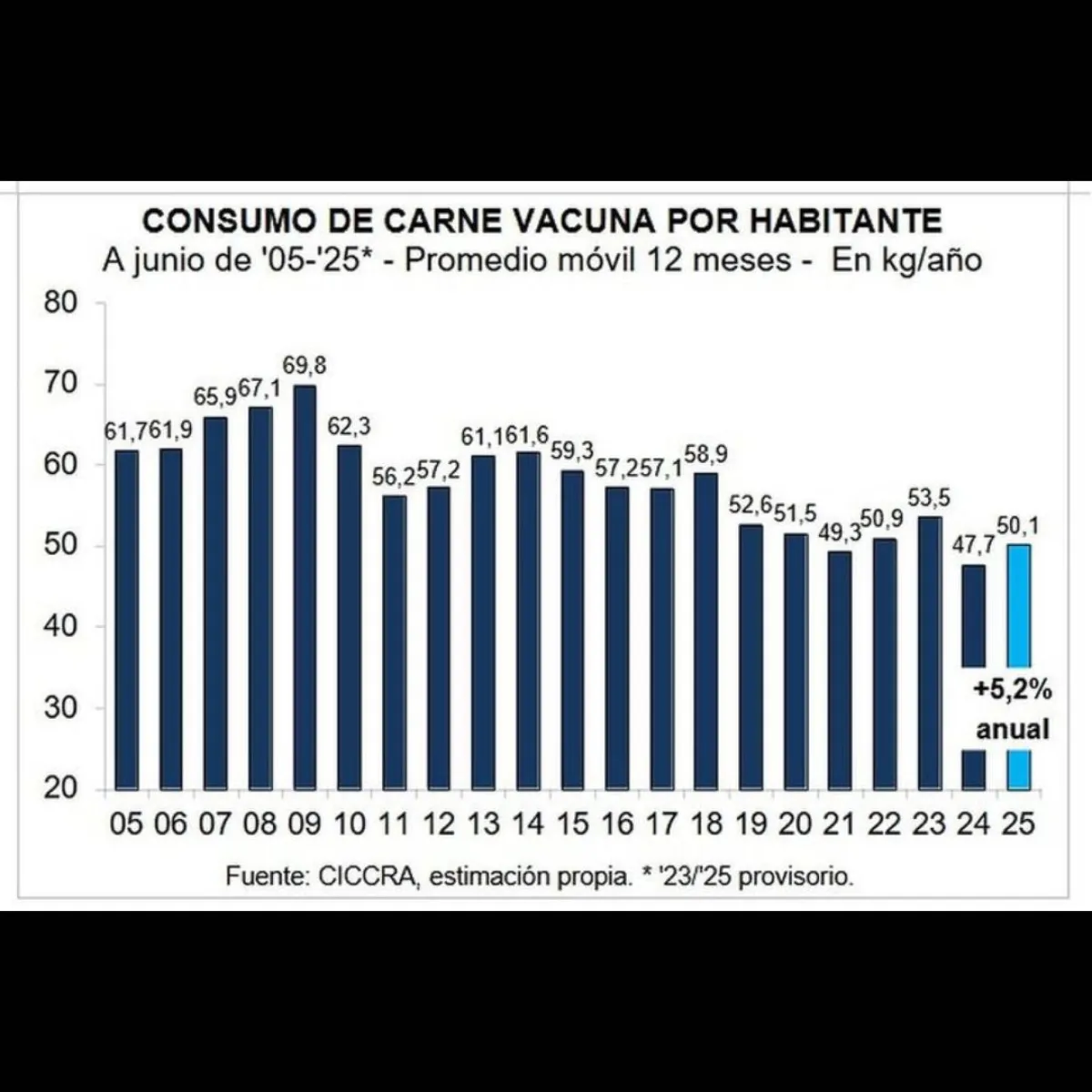 En junio, el consumo per cápita se ubicó en 50,1 kilos anuales, cifra que representa un alza interanual del 5,2% y que se acerca a los valores de 2021. No obstante, aún se encuentra por debajo de los niveles históricos, ya que el promedio de 2024 fue de 47,7 kilos por habitante, una baja del 9% frente a 2023. Este descenso fue acompañado por un aumento considerable en el consumo de otras carnes más económicas, como el pollo y el cerdo. Actualmente, con el mismo dinero que se compra un kilo de carne vacuna, se pueden adquirir hasta tres kilos de pollo o dos de cerdo, lo que motivó un cambio en los hábitos alimenticios.