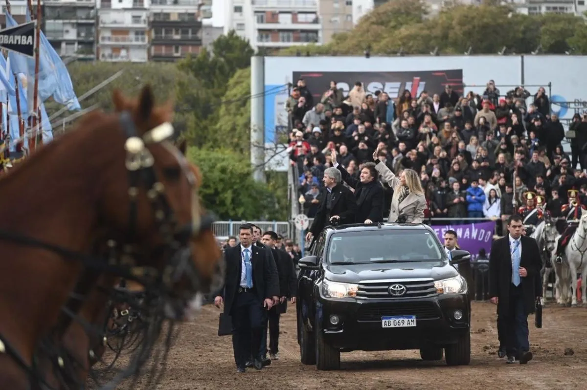 Milei llegó acompañado por su hermana Karina y el ministro Luis Caputo, pero sin la presencia de la vicepresidenta Victoria Villarruel, a quien volvió a apuntar indirectamente. Aprovechó el acto para cuestionar las críticas a sus viajes internacionales, asegurando que han generado beneficios económicos.
