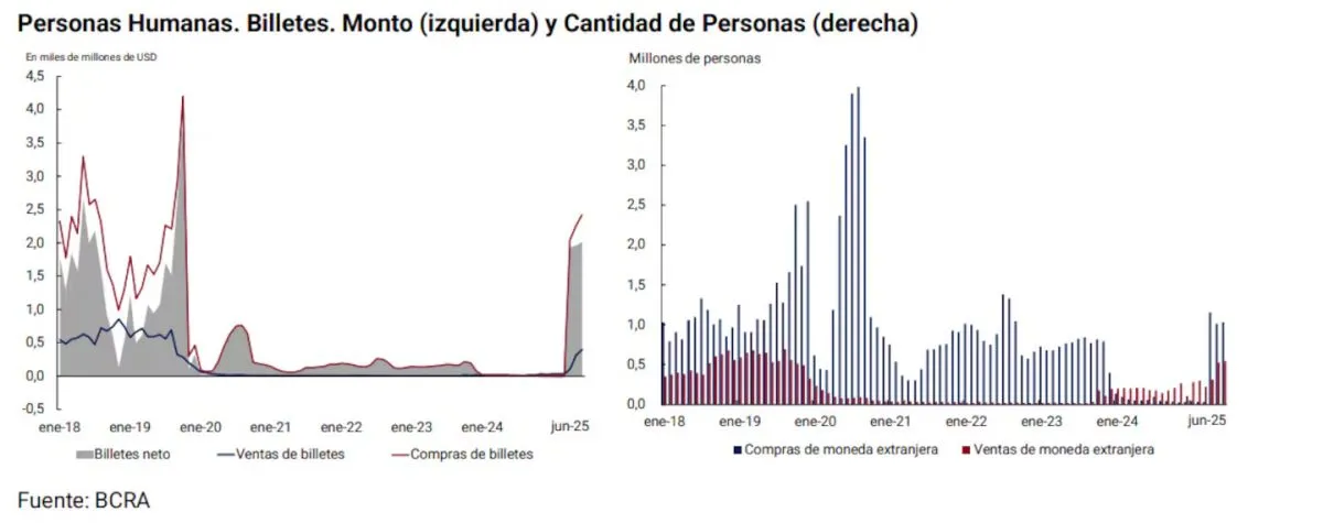 Estas cifras representan un incremento frente a mayo, cuando se habían adquirido US$2262 millones y vendido US$349 millones. En términos netos, las compras alcanzaron los US$4328 millones, aunque parte de esos fondos permanecen en el sistema financiero local o se destinan al pago de consumos en moneda extranjera.