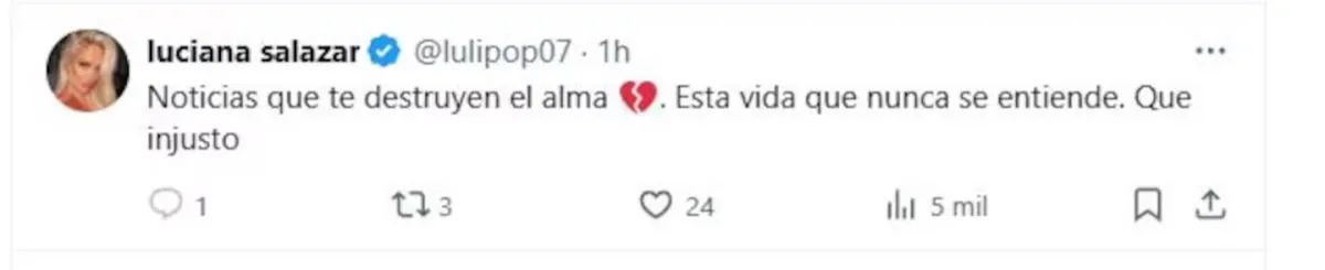 Luciana Salazar también manifestó su pesar a través de un mensaje cargado de emoción: "Noticias que destruyen el alma. Esta vida nunca se entiende. Qué injusto", posteó. Sus palabras reflejaron el sentimiento general de incredulidad ante la pérdida de una niña tan pequeña.