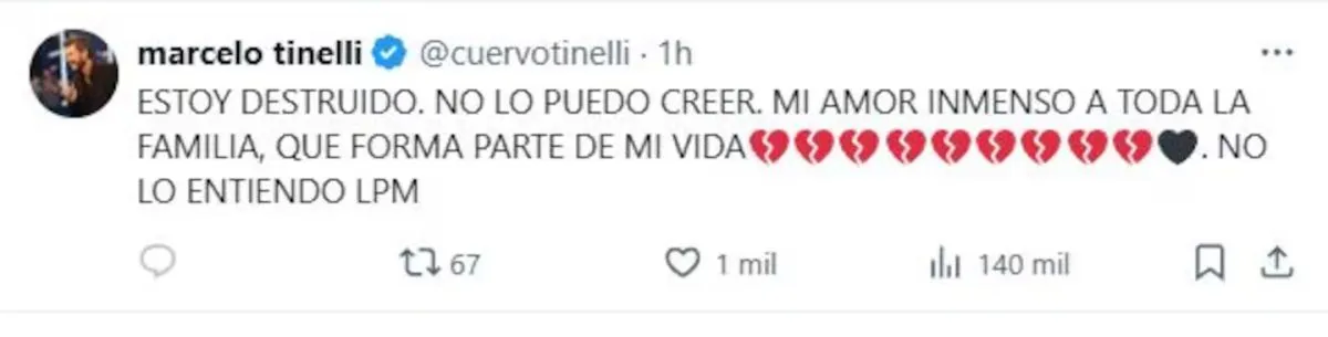 Uno de los primeros en reaccionar fue Marcelo Tinelli, quien compartió su desconsuelo en redes sociales. “Estoy destruido. No lo puedo creer”, escribió en su cuenta de X. Y añadió: “Mi amor inmenso a toda la familia, que forma parte de mi vida. No lo entiendo”, junto a varios emojis de corazones rotos y uno negro.