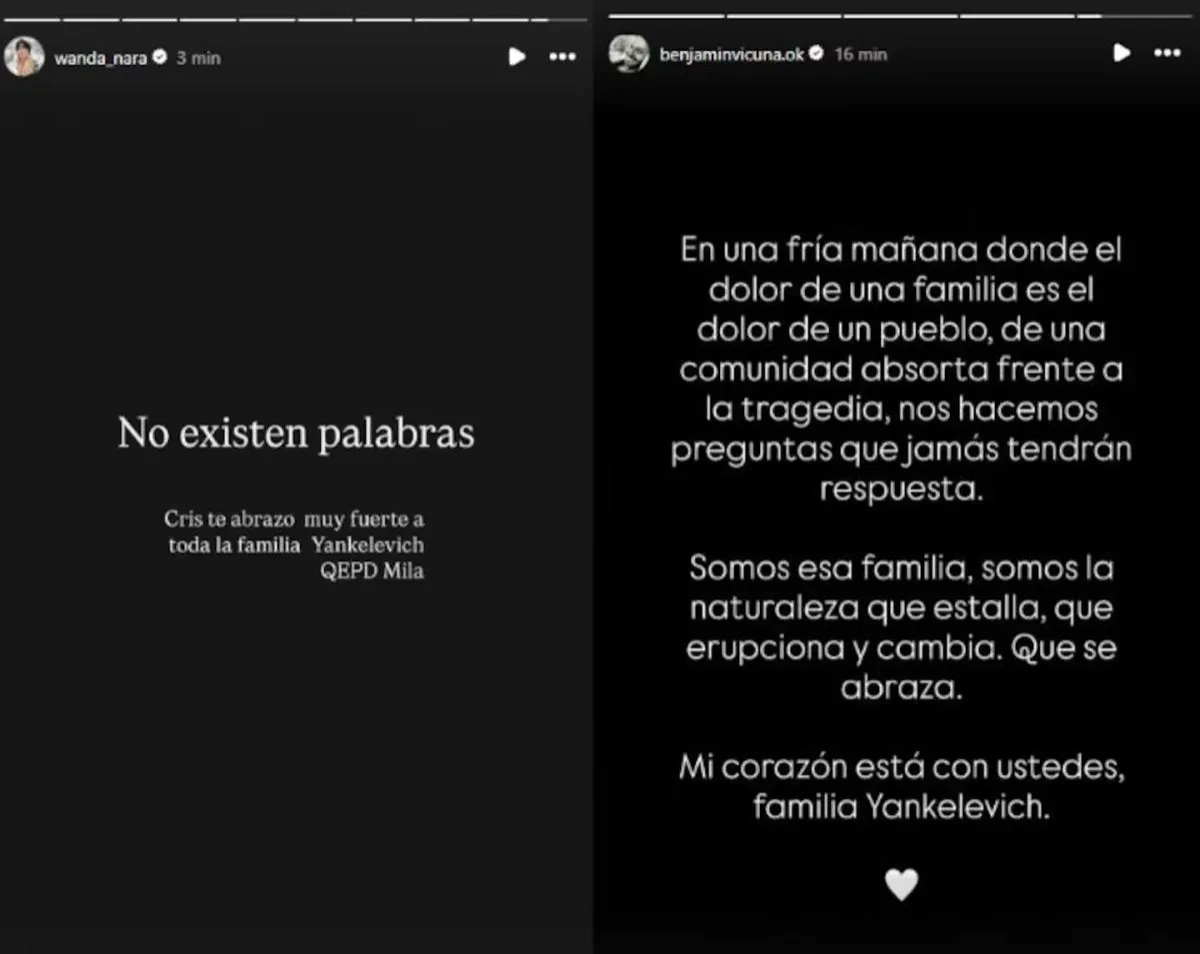 Desde el exterior, Wanda Nara publicó un mensaje dirigido especialmente a Cris Morena: "No existen palabras. Cris, te abrazo muy fuerte a vos y a toda la familia Yankelevich. QEPD Mila". También Benjamín Vicuña, quien sufrió una pérdida similar en 2008, compartió un extenso texto donde empatizó con el dolor familiar.