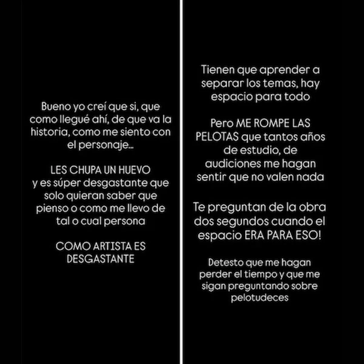 A través de sus publicaciones, la bailarina dejó en claro su desilusión: “Soy experta en esperar cosas que nunca van a cambiar”, manifestó con resignación. También explicó su incomodidad durante la ronda de prensa: “Si ven notas mías (con las trenzas) con cara de orto es porque era una ronda de prensa de LA OBRA en la que voy a estar en el GRAN REX. IMAGÍNENSE si me preguntaron algo sobre eso…”. Con estas palabras, evidenció su enojo ante la falta de preguntas relacionadas con el espectáculo.