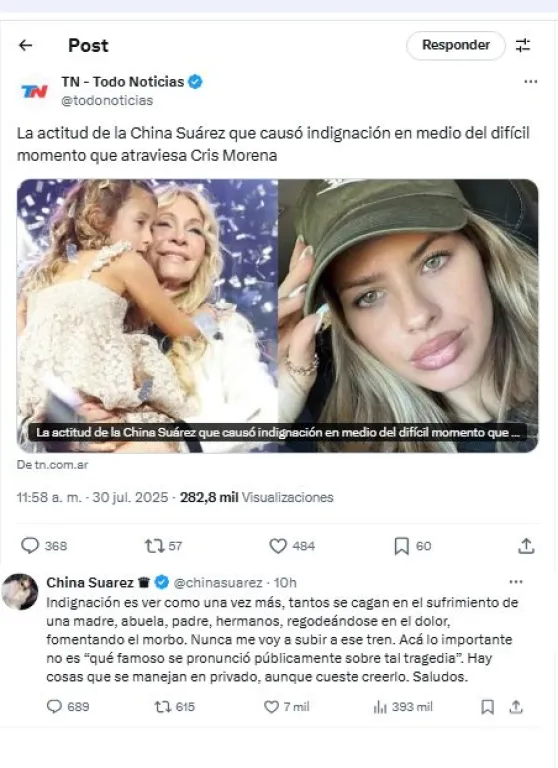 Frente a un titular del medio TN, la cantante tomó la posta y respondió: "Indignación es ver como una vez más, tantos se cagan en el sufrimiento de una madre, abuela, padre, hermanos, regodeándose en el dolor, fomentando el morbo. Nunca me voy a subir a ese tren".